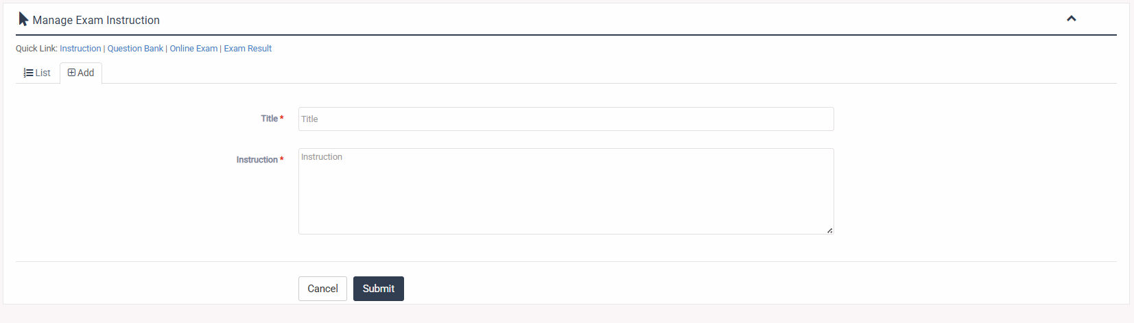 1. Login to System Admin Panel. 2. Select Instruction sub menu under Online Exam main menu from left side bar. 3. To Add/Create new Instruction click Add tab. 4. To Edit Instruction Click Edit button in the Instruction list. 5. To Delete Instruction Click Delete button in the Instruction List. 6. You are done with Instruction feature.