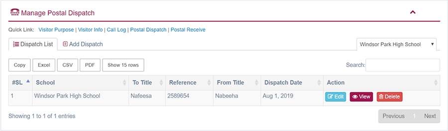 1. Login to System Admin Panel. 2. Select Postal Dispatch sub menu under Front Office menu from left side bar. 3. To add/create new Postal Dispatch click Add Postal Dispatch tab. 4. To edit Postal Dispatch Click Edit button in the Postal Dispatch list. 5. To Delete Postal Dispatch Click Delete button in the Postal Dispatch list. 6. You are done with Postal Dispatch feature.