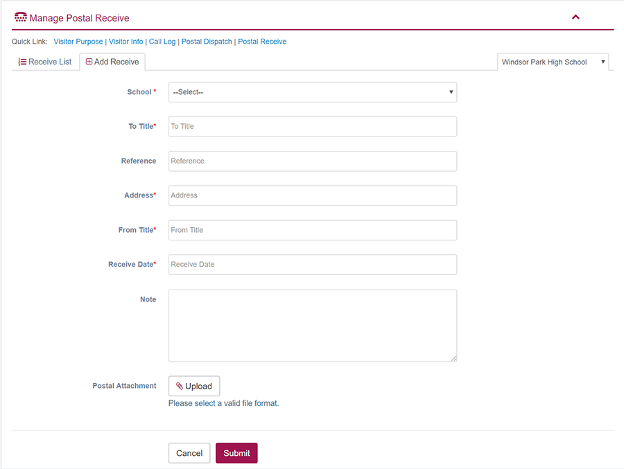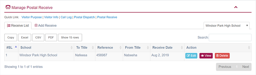 1. Login to System Admin Panel. 2. Select Postal Receive sub menu under Front Office menu from left side bar. 3. To add/create new Postal Receive click Add Postal Receive tab. 4. To edit Postal Receive Click Edit button in the Postal Receive list. 5. To Delete Postal Receive Click Delete button in the Postal Receive list. 6. You are done with Postal Receive feature.
