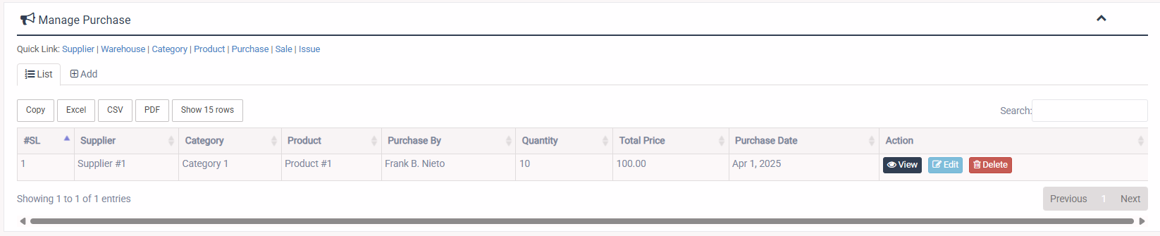 1. Login to System Admin Panel. 2. Select Purchase sub menu under Inventory main menu from left side bar. 3. To Add/Create new Purchase click Add tab. 4. To Edit Purchase Click Edit button in the Purchase list. 5. To Delete Purchase Click Delete button in the Purchase List. 6. You are done with Manage Purchase feature.![]()