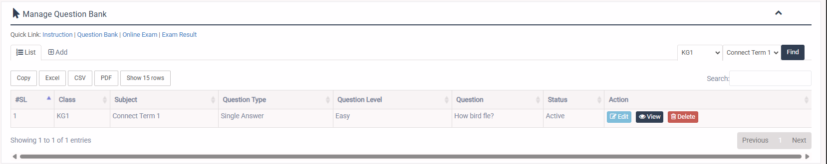 1. Login to System Admin Panel. 2. Select Question Bank sub menu under Online Exam main menu from left side bar. 3. To Add/Create new Question Bank click Add tab. 4. To Edit Question Click Edit button in the Question Bank list. 5. To Delete Question Click Delete button in the Question Bank List. 6. To list all Questions Select the Grade and Subject and click on find button. 6. You are done with Manage Question Bank feature.