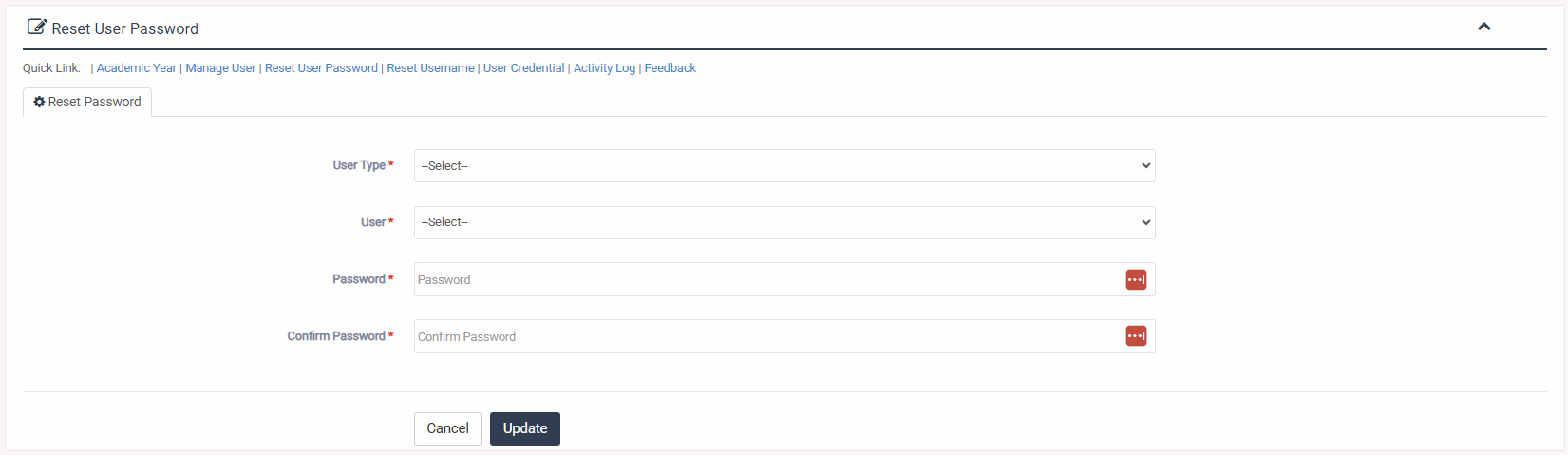1. Login to System Admin Panel. 2. Select Reset User Password sub menu under Administrator menu from left side bar. 3. Then select User Type & User and fill up Password & Confirm Password Fields with expected value/data. 5. Then click Update button to reset user password 6. You are done with Reset User Password feature.