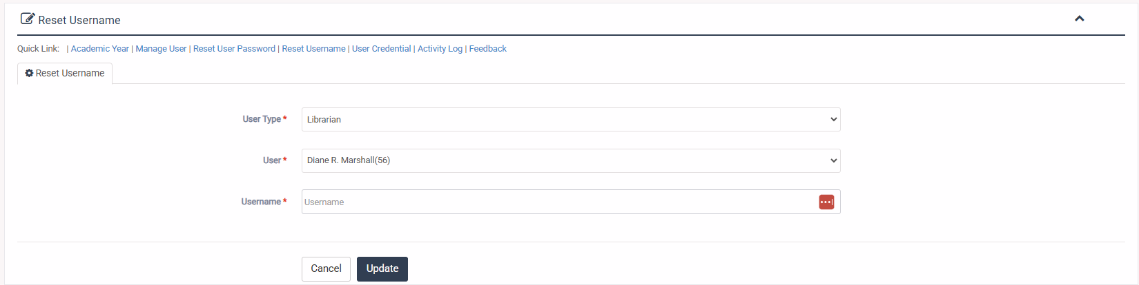 1. Login to System Admin Panel. 2. Select Reset Username sub menu under Administrator menu from left side bar. 3. Then select User Type & User and fill up the Username Field with expected value/data. 5. Then click Update button to reset user password 6. You are done with Reset Username feature.