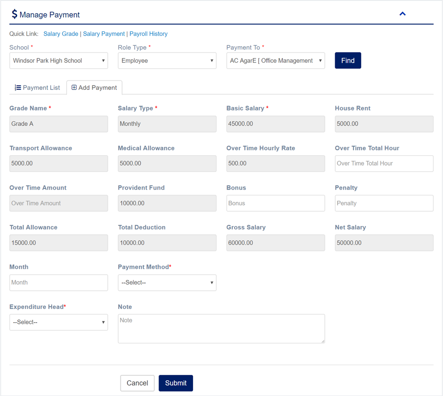 1. Login to System Admin Panel. 2. Select Salary Payment sub menu under Payroll main menu from left side bar. 3. To Salary Payment select Role Type and payment to and then click find. 4. Then Input Month/Bonus/Hour/Penalty etc submit Salary Payment for Employee or Teacher. 6. You are done with Salary Payment feature.