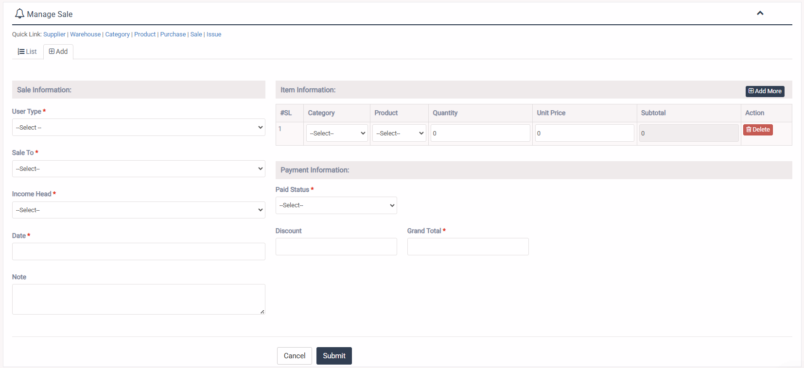 1. Login to System Admin Panel. 2. Select Sale sub menu under Inventory main menu from left side bar. 3. To Add/Create new Sale click Add tab. 4. To Edit Sale Click Edit button in the Sale list. 5. To Delete Sale Click Delete button in the Sale List. 6. You are done with Manage Sale feature.![]()
