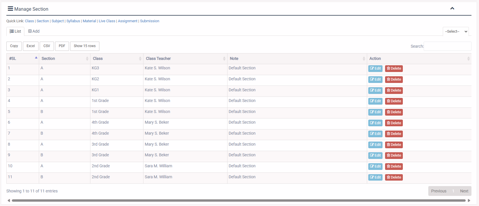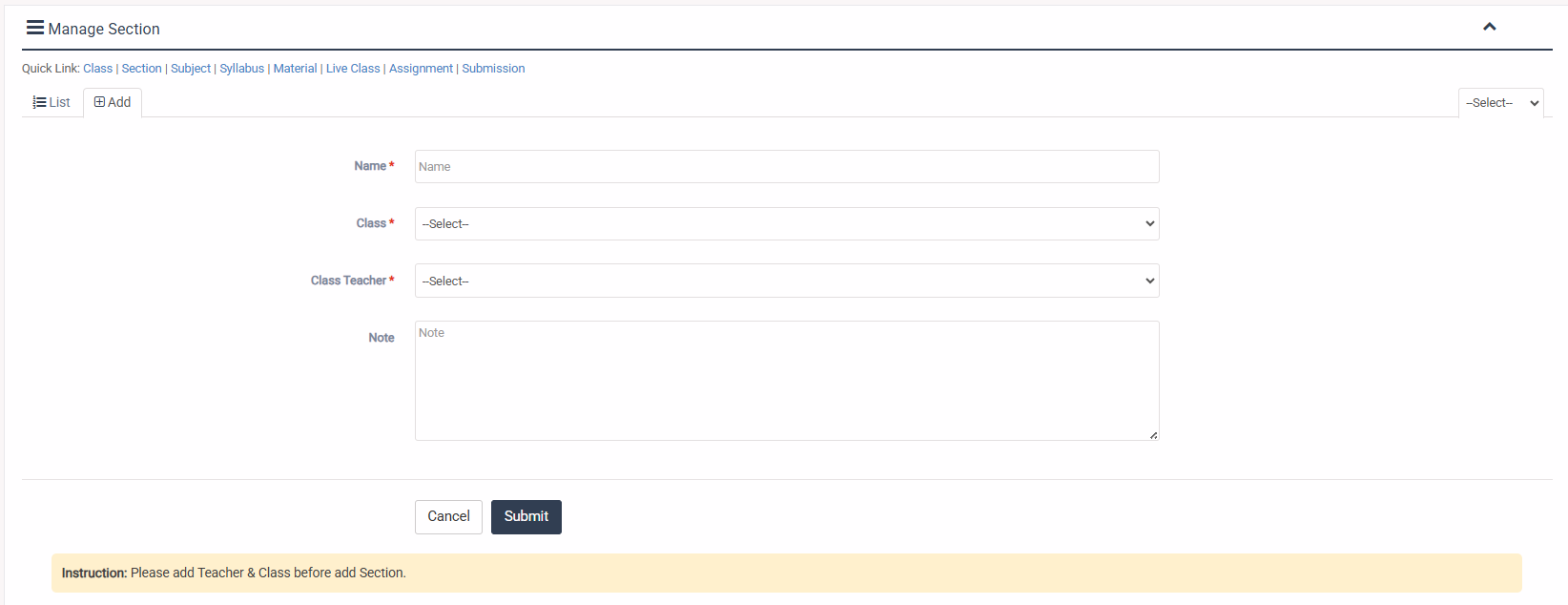 1. Login to System Admin Panel. 2. Select Section sub menu under Academic main menu from left side bar. 3. To Add/Create new Section click Add Section tab. 4. To Edit Section Click Edit button in the Section list. 5. To Delete Section Click Delete button in the Section List. 6. You are done with Manage Section feature. Instruction: Please add Teacher & Class before add Section.
