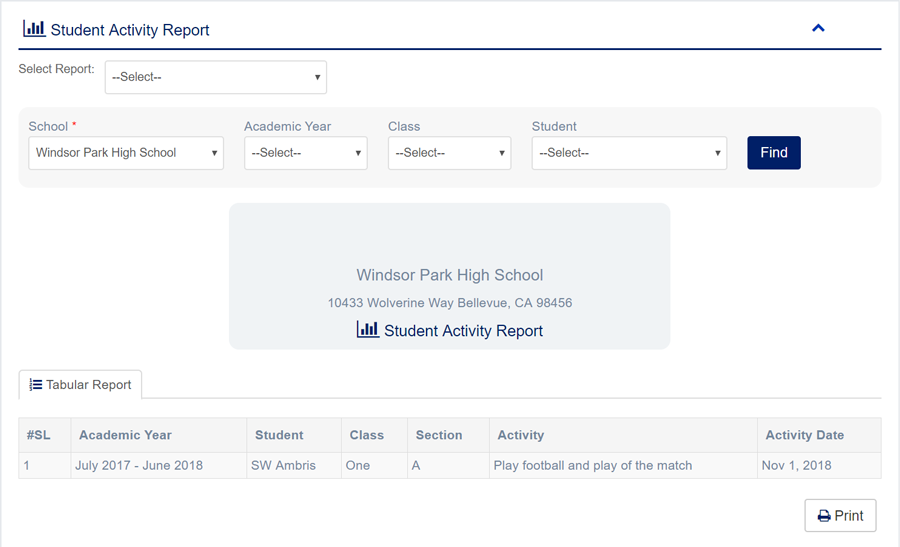 1. Login to System Admin Panel. 2. Select Student Activity Report sub menu under Report main menu from left side bar. 3. To View Student Activity Report choose Academic Year, Class, Student. 4. Then click Find button and you will see Student Activity Report. 6. You are done with Student Activity Report feature.