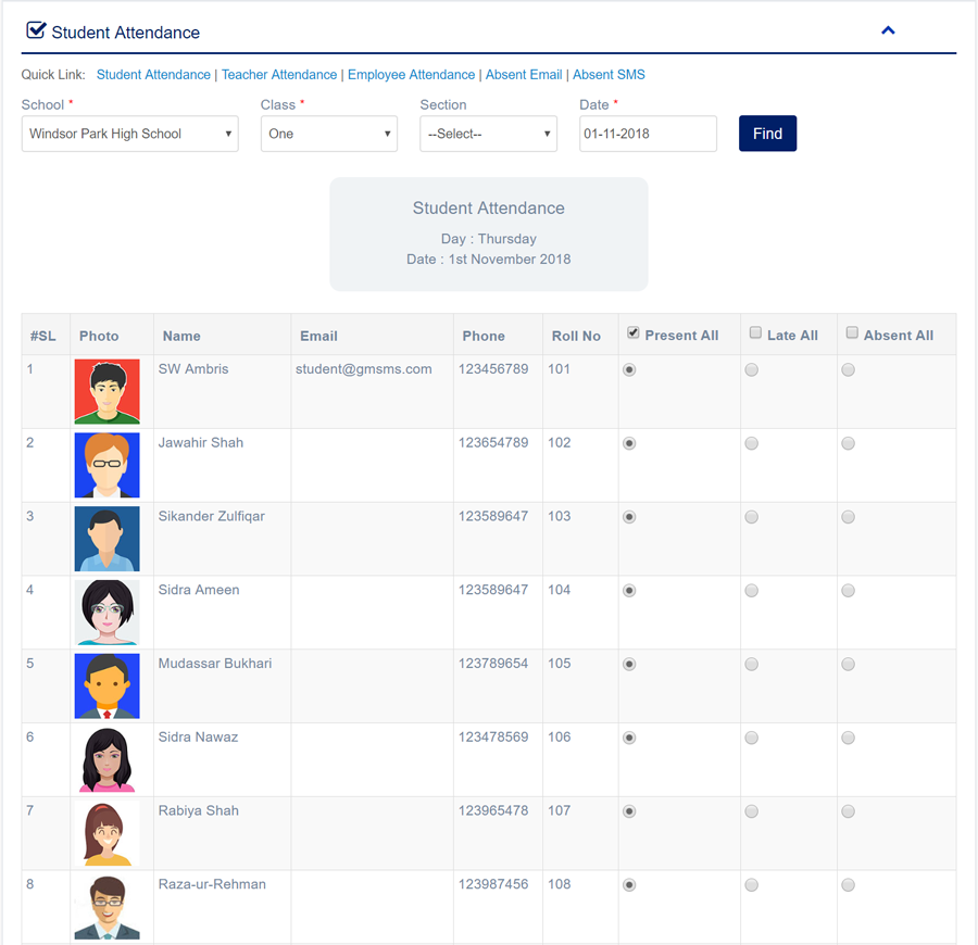1. Login to System Admin Panel. 2. Select Student Attendance sub menu under Attendance main menu from left side bar. 3. Then choose Class, Section & Date 4. Then click Find button to get Student list 5. To Manage Student Attendance Check for Present All or Late All or Absent All 6. You are done with Student Attendance feature.