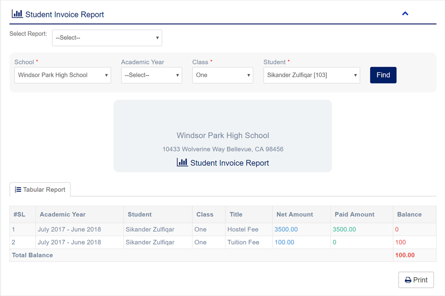 - Student Invoice Report