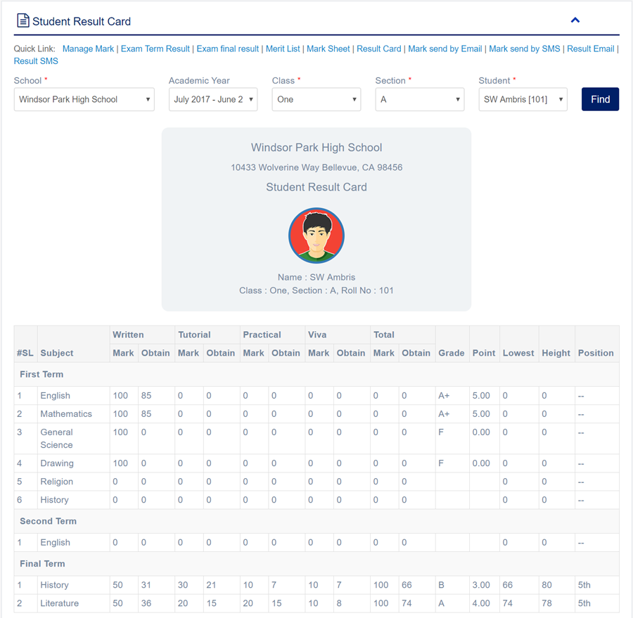 1. Login to System Admin Panel. 2. Select >Exam Result Report sub menu under Report main menu from left side bar. 3. To View Exam Result Report choose Academic Year, Class, Section. 4. Then click Find button and you will see >Exam Result Report. 6. You are done with >Exam Result Report feature.