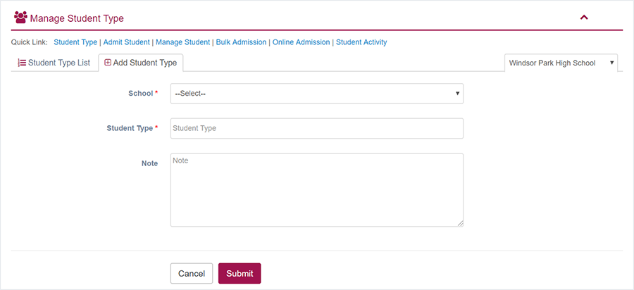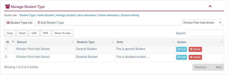 1. Login to System Admin Panel. 2. Select Student Type sub menu under Student Type main menu from left side bar. 3. To Add/Create new Student Type click Add Student Type tab. 4. To Edit Student Type Click Edit button in the Student Type list. 5. To Delete Student Type Click Delete button in the Student Type List. 6. You are done with Manage Student feature.