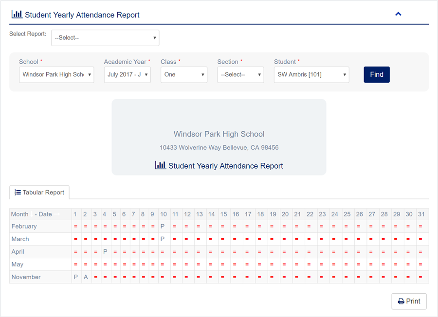 1. Login to System Admin Panel. 2. Select Student Yearly Attendance Report sub menu under Report main menu from left side bar. 3. To View Student Yearly Attendance Report choose Academic Year, Class,Section, Student. 4. Then click Find button and you will see Student Yearly Attendance Report. 5. You are done with Student Yearly Attendance Report feature.