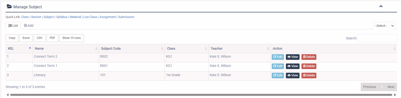 1. Login to System Admin Panel. 2. Select Subject sub menu under Academic main menu from left side bar. 3. To Add/Create new Subject click Add Subject tab. 4. To Edit Subject Click Edit button in the Subject list. 5. To Delete Subject Click Delete button in the Subject List. 6. You are done with Manage Section feature.