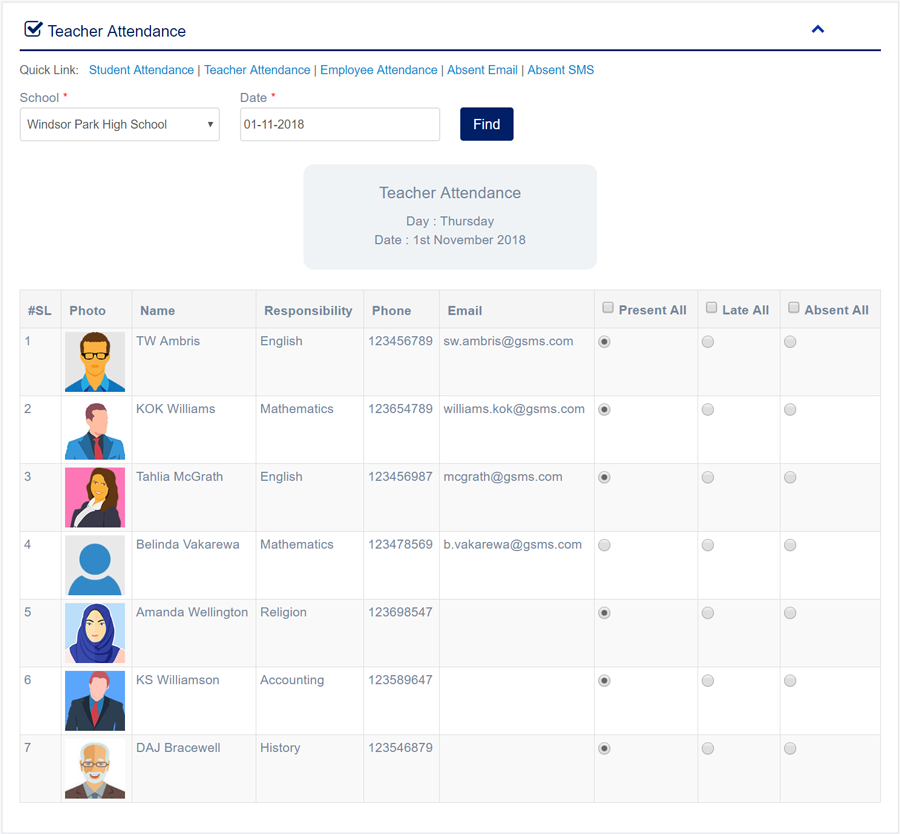 1. Login to System Admin Panel. 2. Select Teacher Attendance sub menu under Attendance main menu from left side bar. 3. Then choose Date and click Find button to get Teacher list 4. To Manage Teacher Attendance Check for Present All or Late All or Absent All 5. You are done with Teacher Attendance feature.