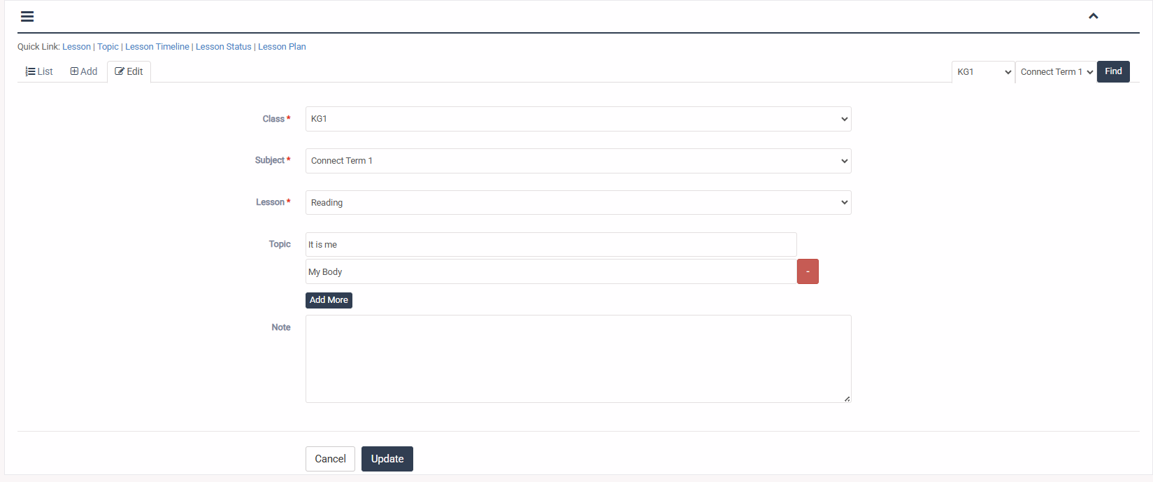 1. Login to System Admin Panel. 2. Select Topic menu under Lesson Plan main menu from left side bar. 3. To Add/Create new Topic click Add Lesson tab. 4. To Edit Topic Click Edit button in the Topic list. 5. To Delete Topic Click Delete button in the Topic List. 6. You are done with Manage Topic feature.