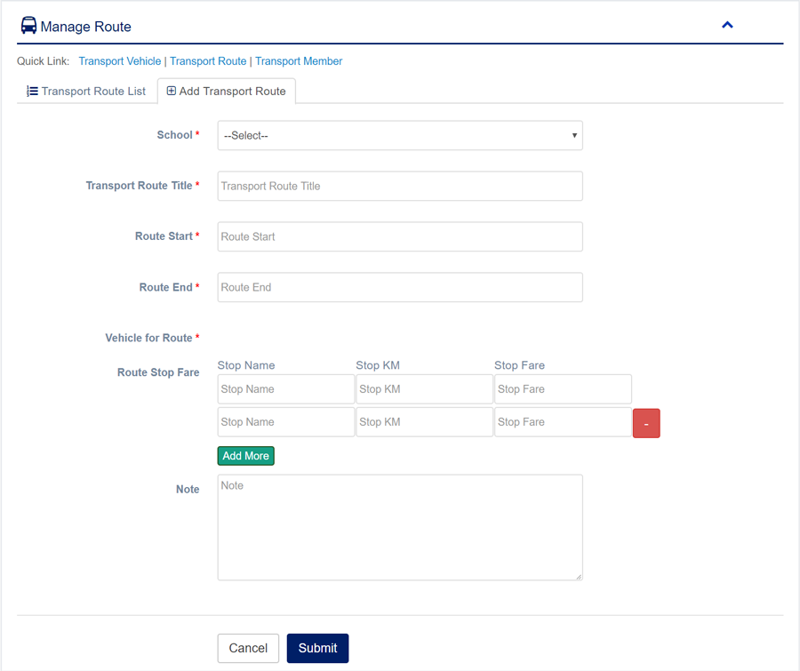 1. Login to System Admin Panel. 2. Select Transport Route sub menu under Transport main menu from left side bar. 3. To Add/Create new Transport Route click Add Transport Route tab. 4. To Edit Transport Route Click Edit button in the Transport Route list. 5. To Delete Transport Route Click Delete button in the Transport Route List. 6. You are done with Manage Transport Route feature.