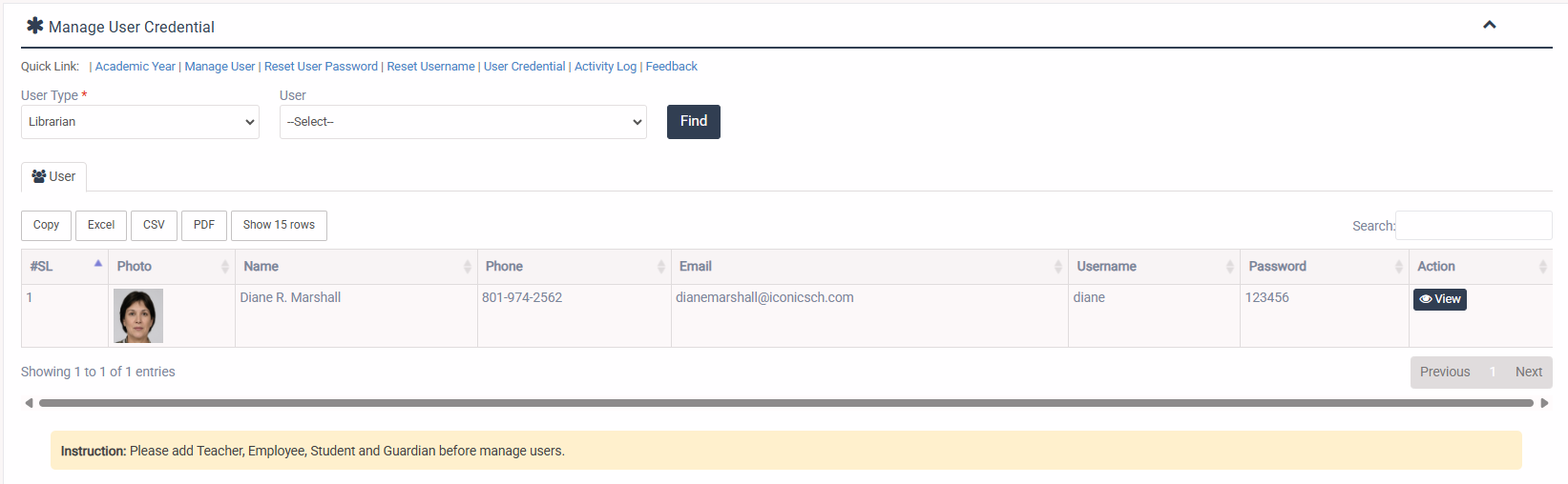 1. Login to System Admin Panel. 2. Select Manage User sub menu under Administrator menu from left side bar. 3. Then select User Type and filter specific user by click Find button. 5. By filter you will get a list of user 6. From the user list you can Activate, Inactivate, Edit & View a user. 7. You are done with User Manage feature. Instruction: Please add Teacher, Employee, Student and Guardian before manage users.