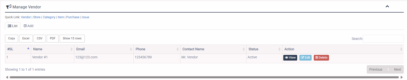 1. Login to System Admin Panel. 2. Select Vendor sub menu under Asset Management main menu from left side bar. 3. To Add/Create new Vendor click Add Book tab. 4. To Edit Vendor Click Edit button in the Vendor list. 5. To Delete Vendor Click Delete button in the Vendor List. 6. You are done with Manage Vendor feature.![]()