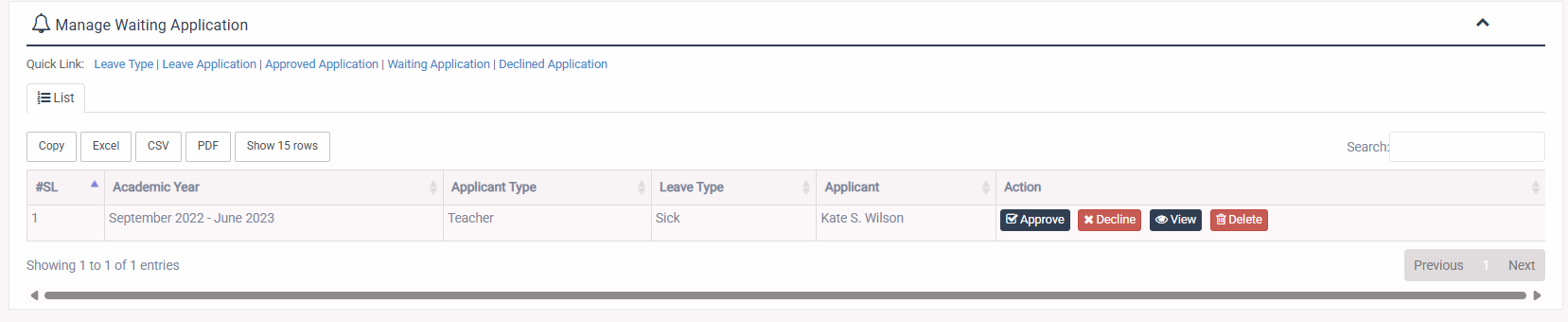 1. Login to System Admin Panel. 2. Select Waiting Application sub menu under Manage Leave menu from left side bar. 3. Admin can approve or decline or view or delete the waiting application. 4. You are done with Waiting Application feature.