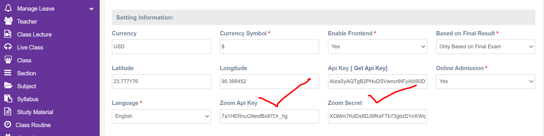 02. After completing the Zoom account sign-up up collect the ZOOM Api Key and Api Secret and save them in the Software. The School Admin has to save under Left Menu-> Settings ->School Settings. Please see the following screenshot.