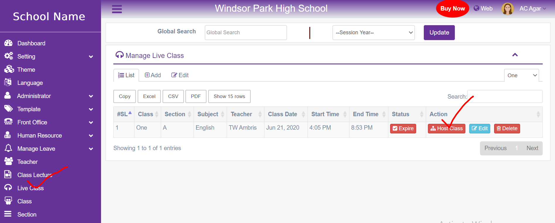 1. Login to System Admin Panel. 2. Select Live Class sub menu under Academic main menu from left side bar. 3. To Add/Create new Live Class click Add tab. 4. To Edit Live Class Click Edit button in the Class Routine list. 5. To Delete Live Class Click Delete button in the Class Routine List. 6. You are done with Live Class feature.![]()